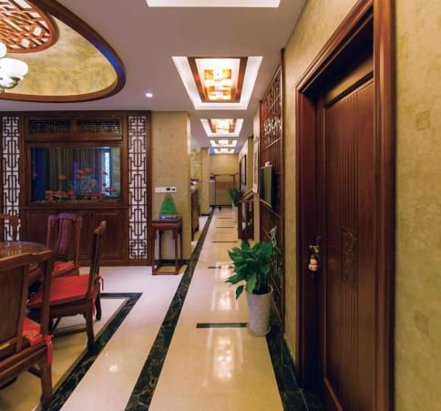 ▲蘋果木的實木門與墻面的實木外型一同彰顯出中式樣式的古樸高雅。