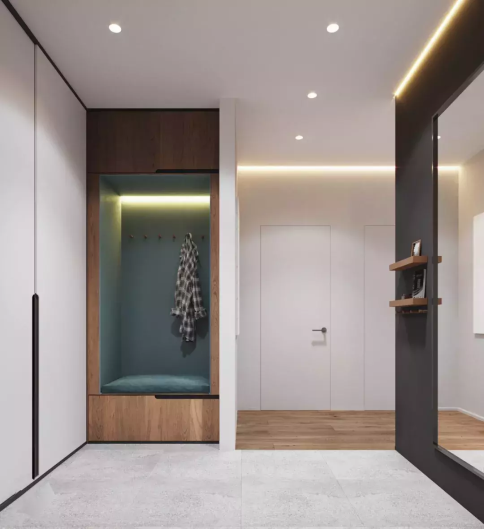 帶有衣帽柜、儲物柜等擁有貯藏性能的空間,是隱形門最常顯現的地區。將它們和門的色彩融為一體,在空間視覺上,起到了較好的協作成效。