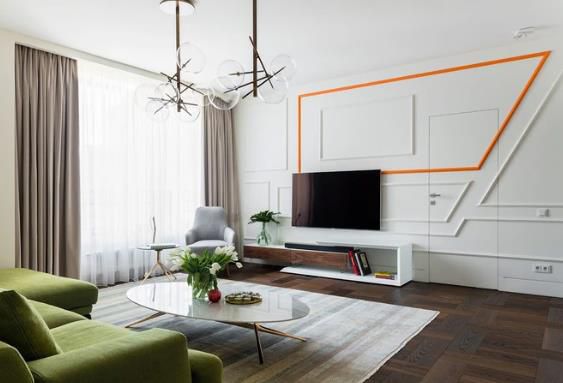 客廳電視架設計獨特,感覺就像一個無縫的塊。不僅電視架,甚至墻壁都被照亮,將娛樂區變成客廳中最令人印象深刻的地方。