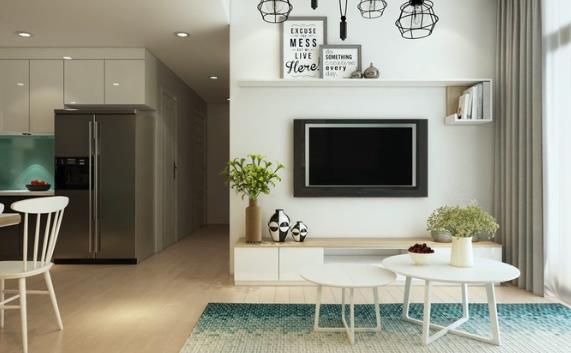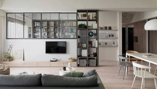 簡約的電視柜搭配獨特的書架。客廳看起來既寬敞又通風,簡單而整潔的電視架和透明的鋼化玻璃可以捕捉到所有的自然光。