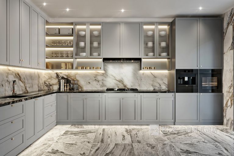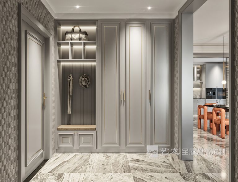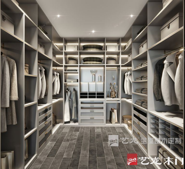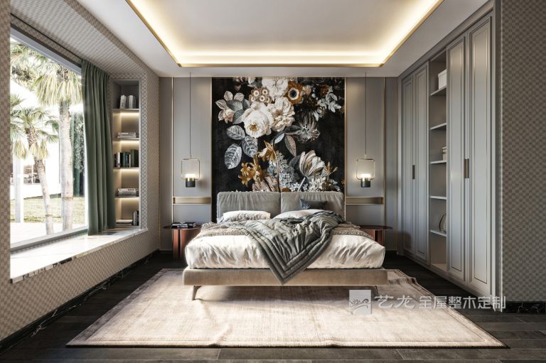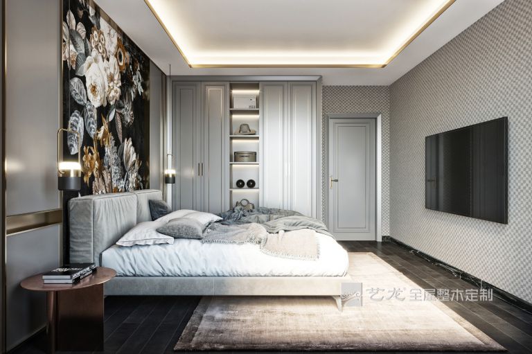 臥室的整個(gè)墻面是淺灰色,床品、軟裝也是灰白色的,搭配淺灰色的衣柜、床頭柜等家具,整個(gè)臥室看起來非常輕松和舒服。